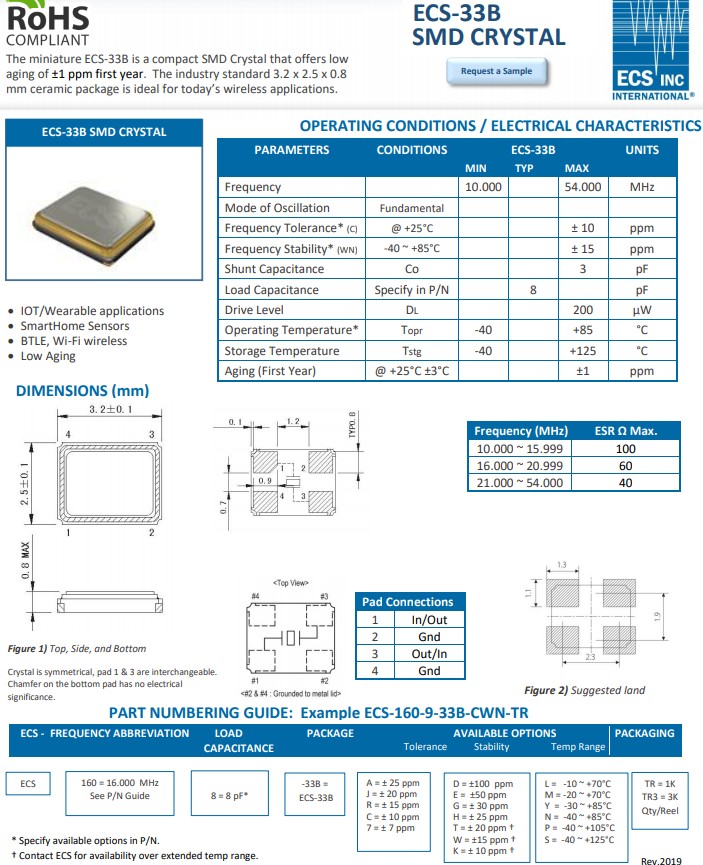 ECS晶振ECS-33B小型紧密稳定SMD晶体,采用小体积尺寸3.2x2.5x0.8mm(LWH)工业标准陶瓷封装四脚贴片晶振,石英晶体谐振器,在+25°C±3°C的温度下,第一年的老化程度极低,最大值为1ppm。每个型号在+25°C时的容差为10ppm(最大值),紧密稳定、低老化、表面贴装石英晶体,非常适用于IOT/可穿戴应用,智能家居传感器,BTLE,物联网,无线Wi-Fi等应用。