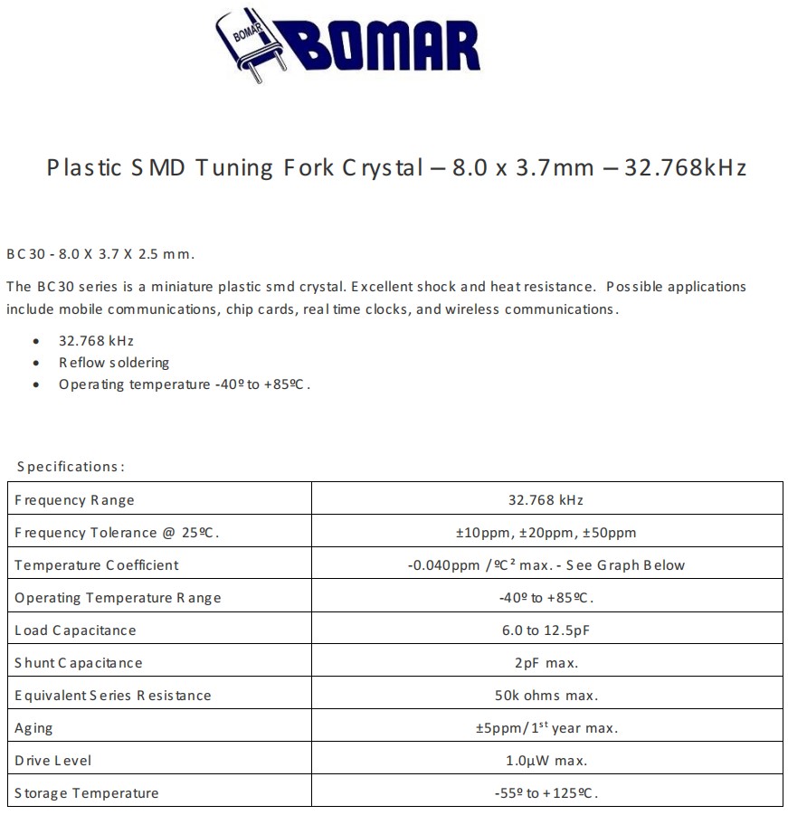博马尔8038mm晶振,BC30CCD112.5-32.768K,实时时钟6G晶振,美国进口晶振,Bomar博马尔晶振,型号:BC30,编码为:BC30CCD112.5-32.768K,频率为:32.768K晶振,小体积晶振尺寸:8.0x3.7x2.5mm陶瓷封装,四脚贴片晶振,无源晶振,石英晶振,石英晶体谐振器,无铅环保晶振,SMD石英晶体。具有超小型,轻薄型,良好的抗冲击性和耐热性。应用程序包括:移动通信、芯片卡、实时时钟,无线通信,智能手环晶振,仪器仪表设备,钟表电子,智能门锁,电脑主板,数码电子等应用。
