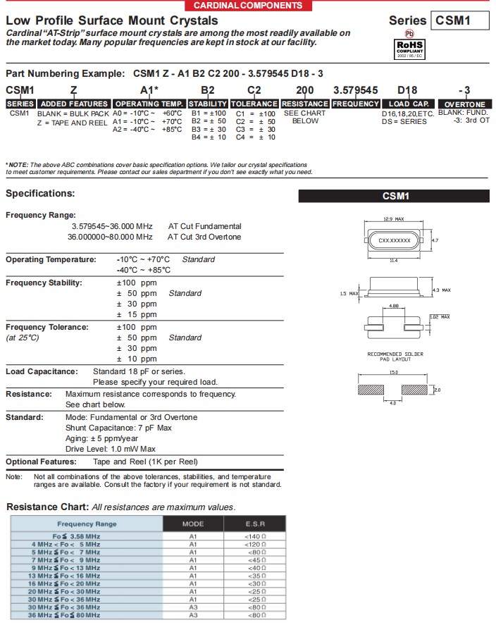 | CSM1Z-A0B2C3-50-15.360D18 | Cardinal晶振 | CSM1 | 15.36MHz | ±50ppm | CRYSTAL 15.3600MHZ 18PF SMD |
