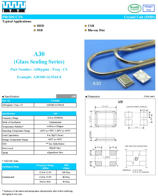 ITTI无源晶振,A30100-24.9344-8,硬盘驱动器6G晶振,香港ITTI晶振,A30系列晶振,编码为:A30100-24.9344-8,频率为:24.9344MHz,小体积晶振尺寸:3.2x2.5mm,四脚贴片晶振,石英晶体谐振器,无源晶振,石英晶振,石英贴片晶振,无铅环保晶振,工作温度范围选项:-20°C to +70°C / -30°C to +85°C,具有超小型,轻薄型,耐热及耐环境特点。应用于:HDD, USB,SSB蓝光光盘,可穿戴设备,无线,蓝牙,车载电子晶振,医疗设备,安防设备,数码电子应用。