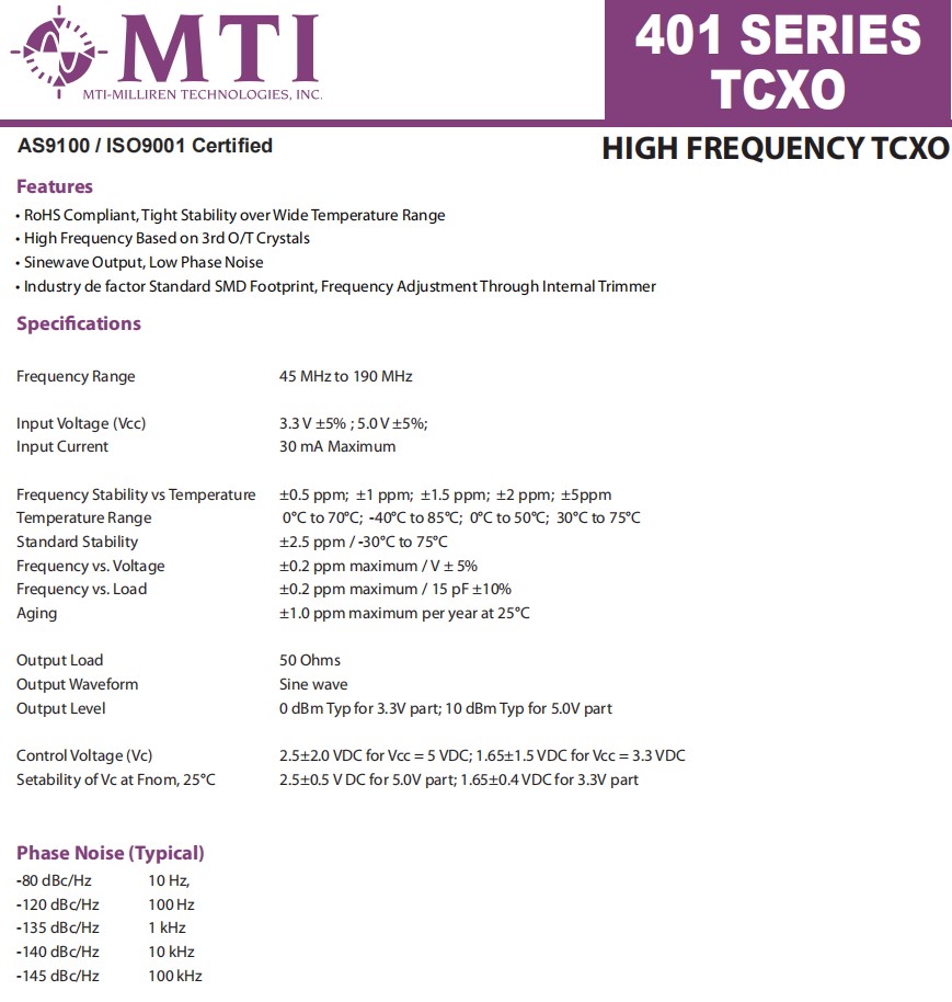 MTI-milliren低抖动晶振,401系列高频TCXO振荡器,6G导航仪晶振,参数表