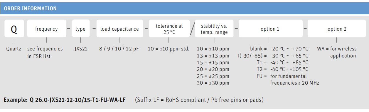 | special frequencies for wireless applications | 14 standard frequencies shown in ESR list (for other frequencies refer to general JXS21 datasheet) |