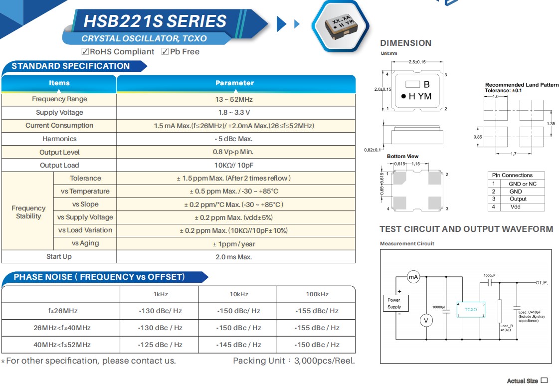 HSB221S,TC2S026000DCCHE-T,26MHz,2520mm,HELE物联网晶振,台湾HELE晶振,加高晶振,型号:HSB221S,编码为:TC2S026000DCCHE-T,频率为:26.000MHz,电压:2.8V,频率稳定性:±50ppm,工作温度范围:-30℃至+85℃,小体积晶振尺寸:2.5x2.0mm封装,四脚贴片晶振,TCXO温补晶振,温补晶体振荡器,石英晶振,石英晶体振荡器,SMD晶振,有源晶振,无铅环保晶振。具有超小型,轻薄型,高精度,高性能,高品质,低抖动晶振,低功耗晶振,低相位噪声,低电源电压等特点。被广泛应用于:移动通讯设备,车载电子晶振,无线网络晶振,物联网晶振,导航仪晶振,智能家居等应用。